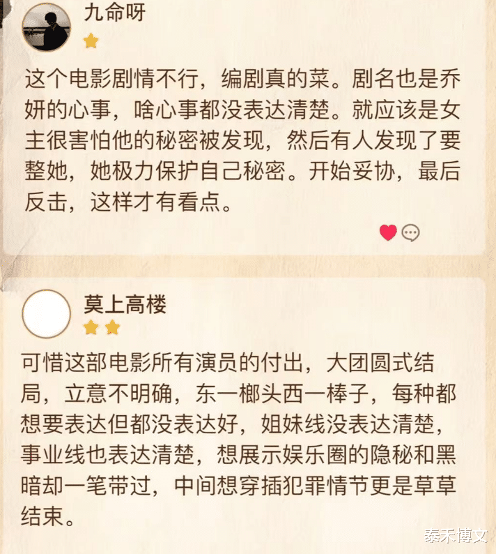 有的不雅众说看结束这部电影说,乔妍有什么隐衷我不知说念,我看完倒是愁肠寸断了。