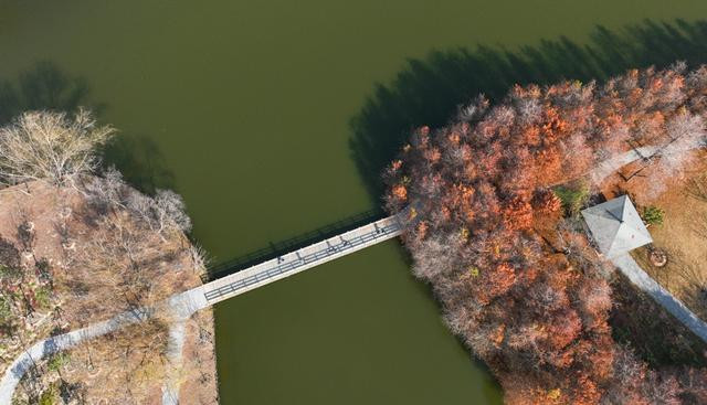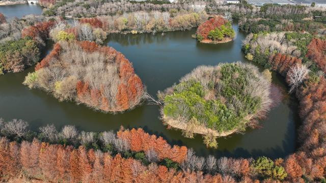 1月9日,在松江区泖田湿地,如镜的水域反照出蓝天与多彩的岸线。红杉与常绿植被神往横生,斑斓的林木为杂沓的岛屿增添别样不满。