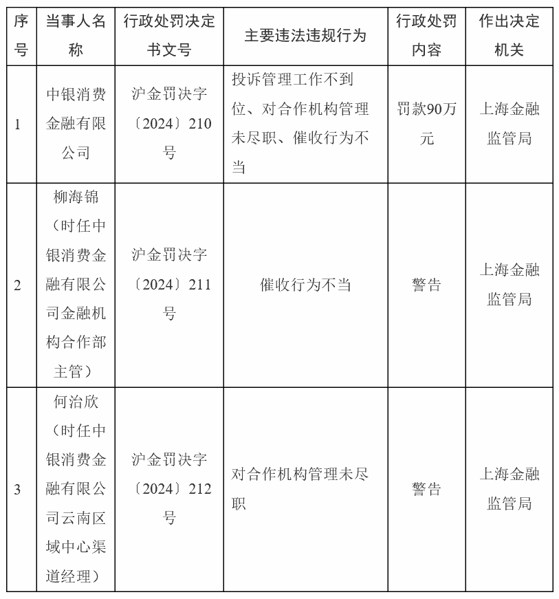 此外,时任中银破钞金融有限公司金融机构勾搭部操纵柳海锦、时任中银破钞金融有限公司云南区域中心渠说念司理何治欣,均被处以劝诫。