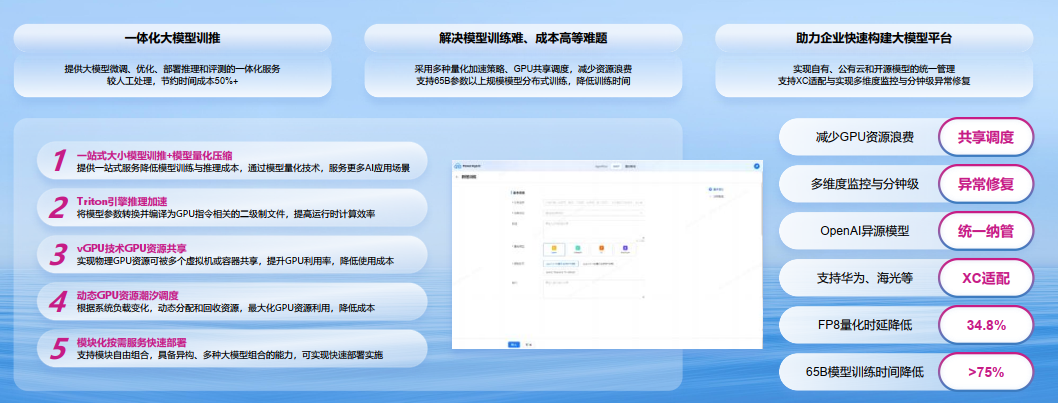 企业级大模子斥地平台 ,一站式奇迹简化大模子训、推、评全经过。平台提供大模子微调、优化、部署推理和评测的一体化奇迹,相对东谈主工处理,可从简50%+的时辰资本。采选多种量化加快计谋、GPU分享膺惩,减少资源花消,撑捏65B参数以上范围模子分手式练习,裁减练习时辰。平台还不错完了自有、公有云和开源模子的和洽料理,撑捏XC适配与完了多维度监控与分钟级十分设立。