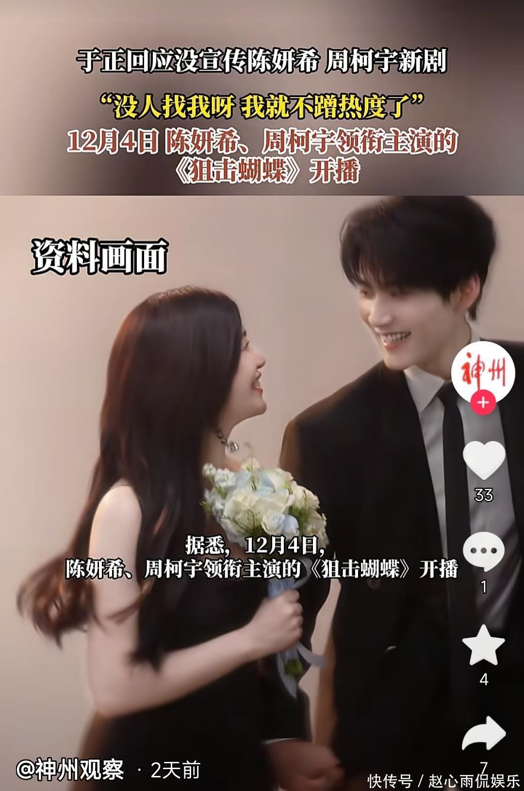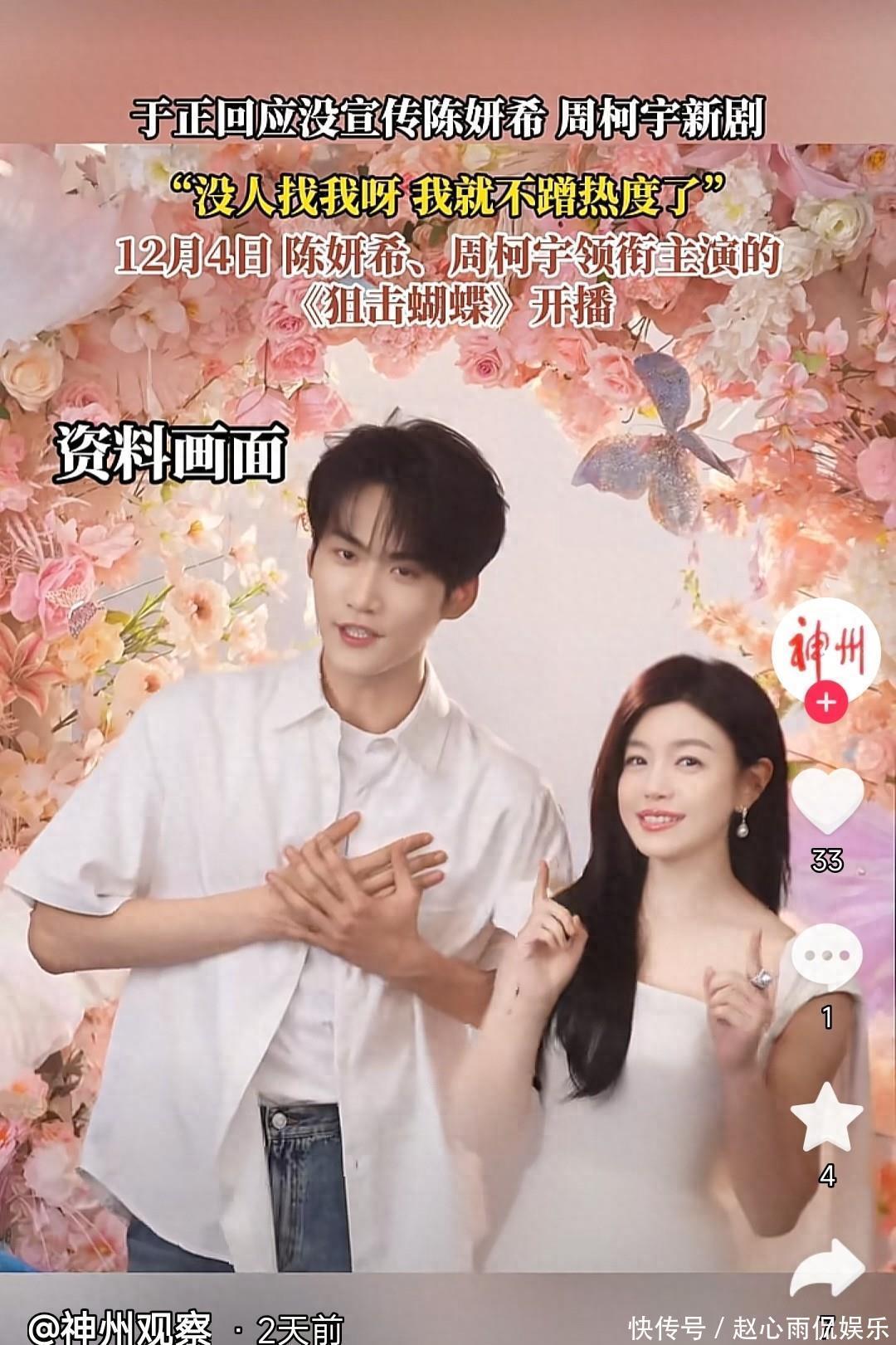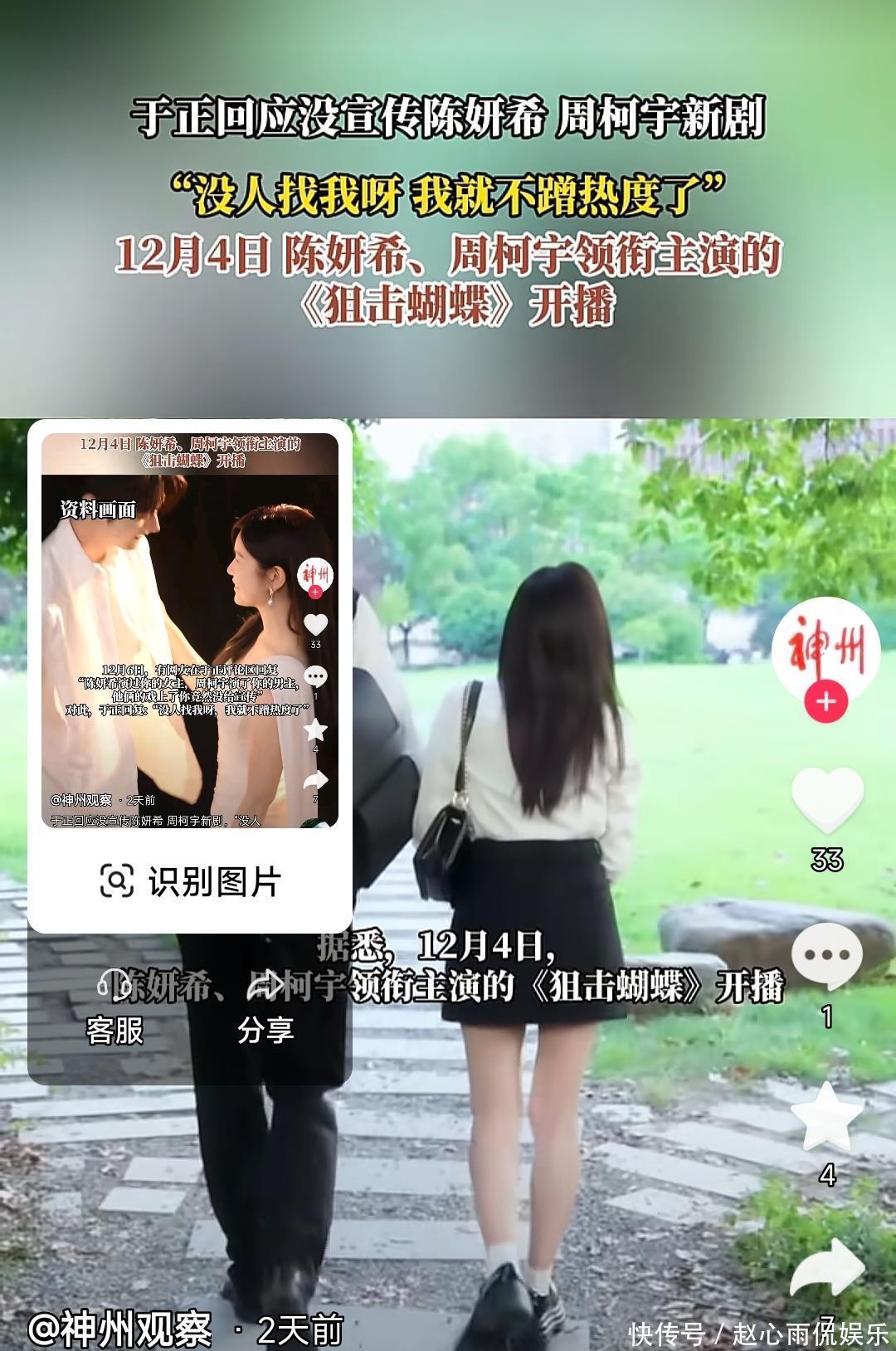 先说说这部《狙击蝴蝶》,12月4日刚开播,由陈妍希和周柯宇领衔主演。这两位演员皆和于正打过交说念,陈妍希演过他剧里的女主,周柯宇也演过他剧里的男主,按说于正几许得给点颜面宣传一下吧,效果他来了这样一出。