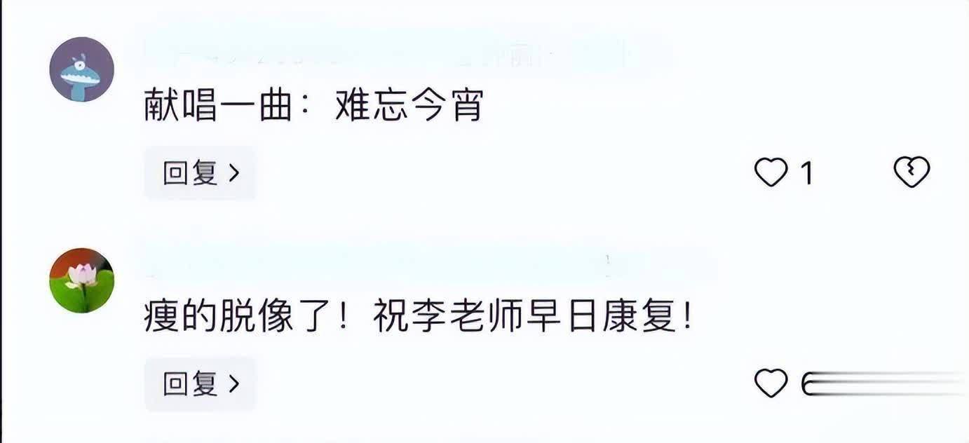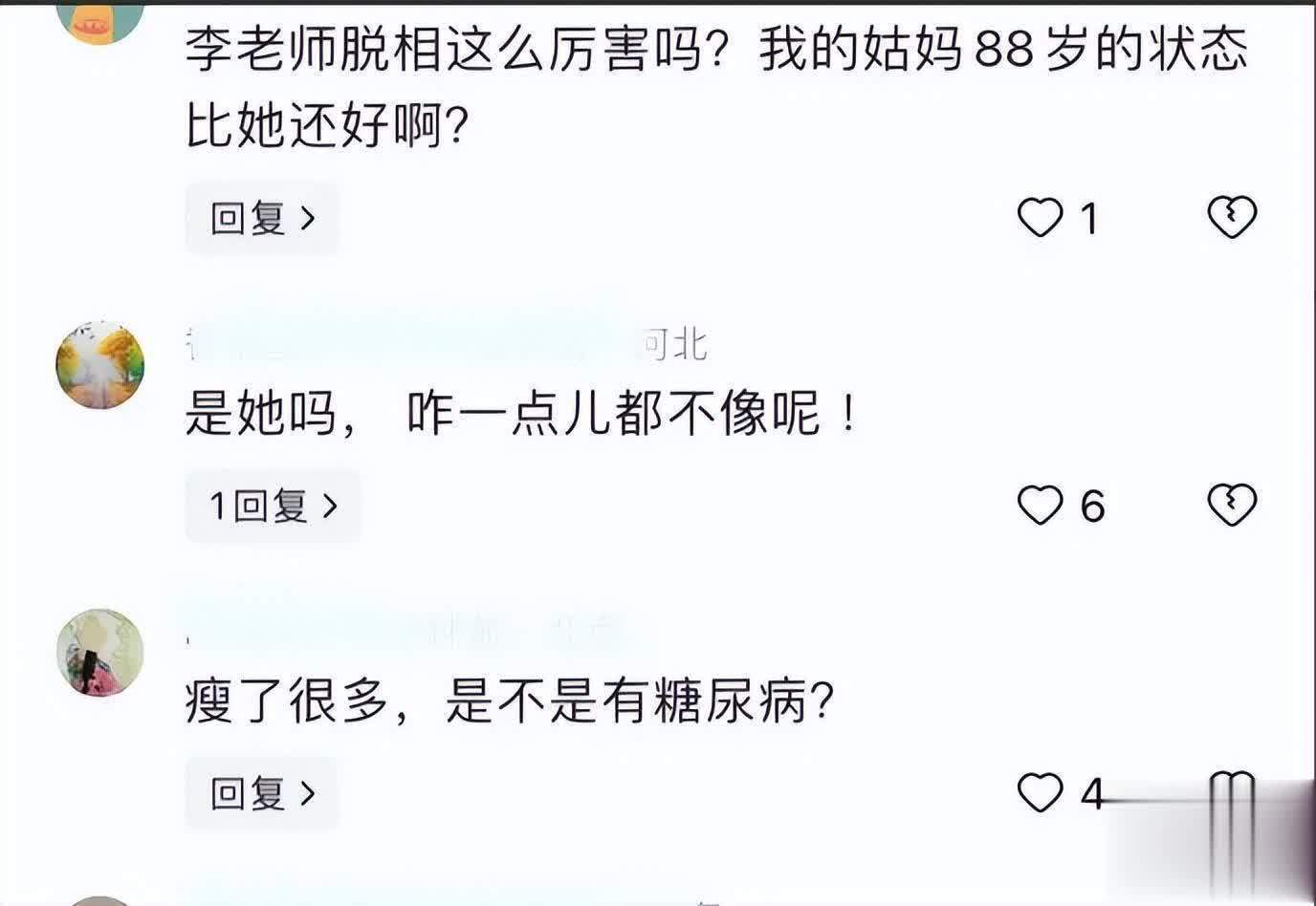 当网友看到80岁的李谷一近况时,纷纷看到偶而和恐慌,纷纷指出她瘦脱相了,还嗅觉不是她,少量齐不像,同期道贺她早日康复。